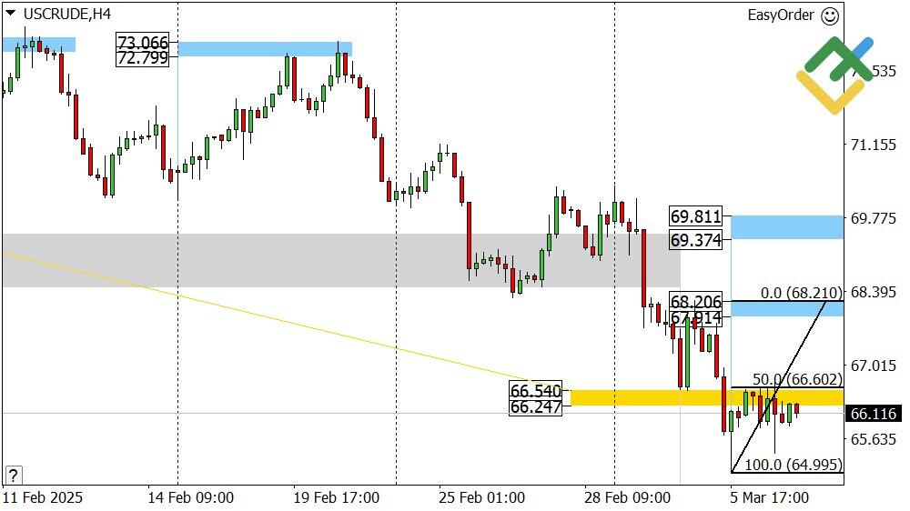 To open new shorts, wait for a correction to strong resistance levels and a sell pattern. Once a sell pattern forms, consider opening shorts, targeting a level of 66.60 and then 64.99.