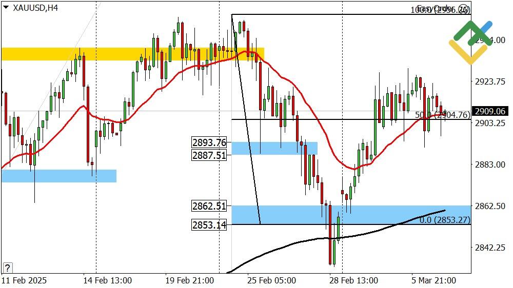 - XAUUSD: Gold is growing from support (В) 2862 – 2853. The second growth target is a level of 2956.