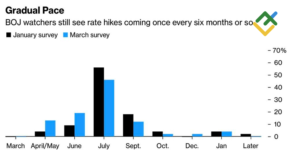 If the rally in Japanese bond yields is not bothering the central bank, why is the USDJPY pair not continuing to fall against the backdrop of a weak US dollar? The main reason is the BoJ’s sluggishness. None of the 52 experts polled by Bloomberg expects the overnight rate to increase at the BoJ meeting on March 19. July remains the most favored option, although the percentage of respondents in favor has dropped from 56% to 48%. A clear majority, 76%, expect rate hikes to take place at 6-month intervals, which curbs the yen’s rally.