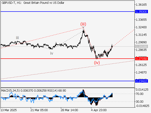The first ascending wave of larger degree 1 of (A) is formed on the daily chart, and a bearish correction is presumably completed as the second wave 2 of (А). The third wave 3 of (А) started developing on the H4 time frame, with the first counter-trend wave of smaller degree i of 3 forming as its part. The H1 chart presumably shows that wave (iii) of i is formed, a local correction is complete as wave (iv) of i, and wave (v) of i started unfolding. If the presumption is correct, the GBP/USD pair will continue to rise to the levels of 1.3500 – 1.4000. The level of 1.2715 is critical in this scenario, as its breakout will enable the pair to continue declining to the levels of 1.2342 – 1.2100.