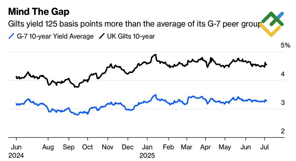 UK 10-Year Gilt Yield and G7 10-Year Bond Yield Average