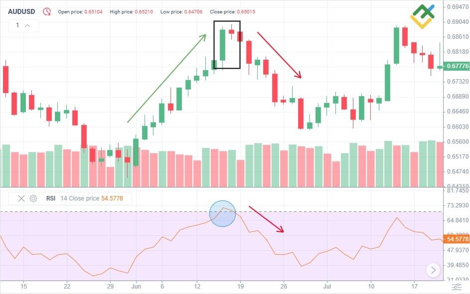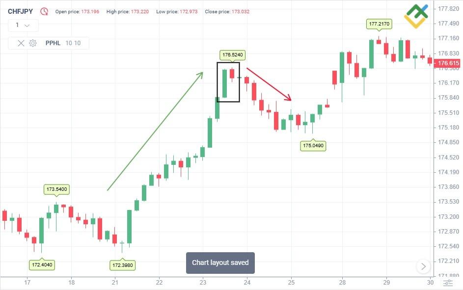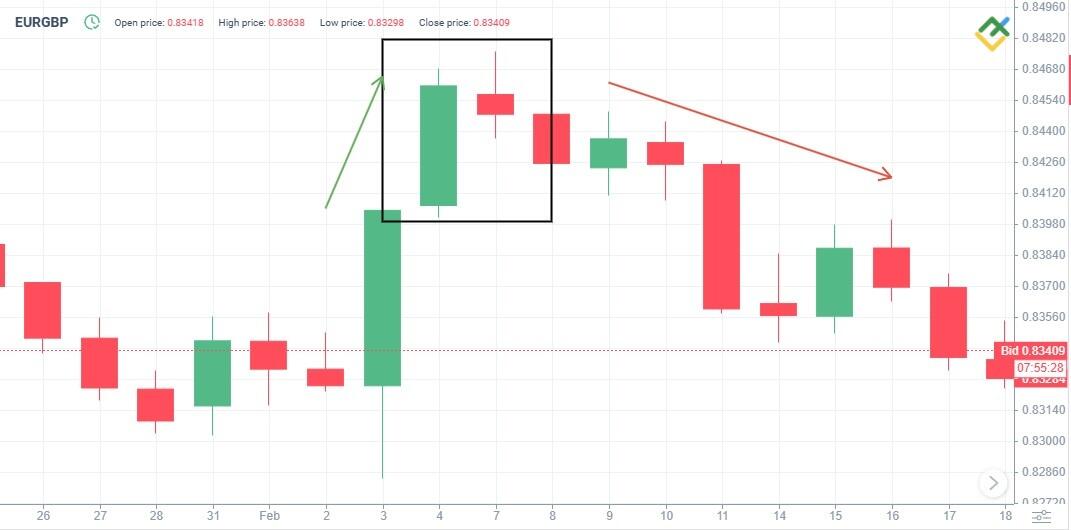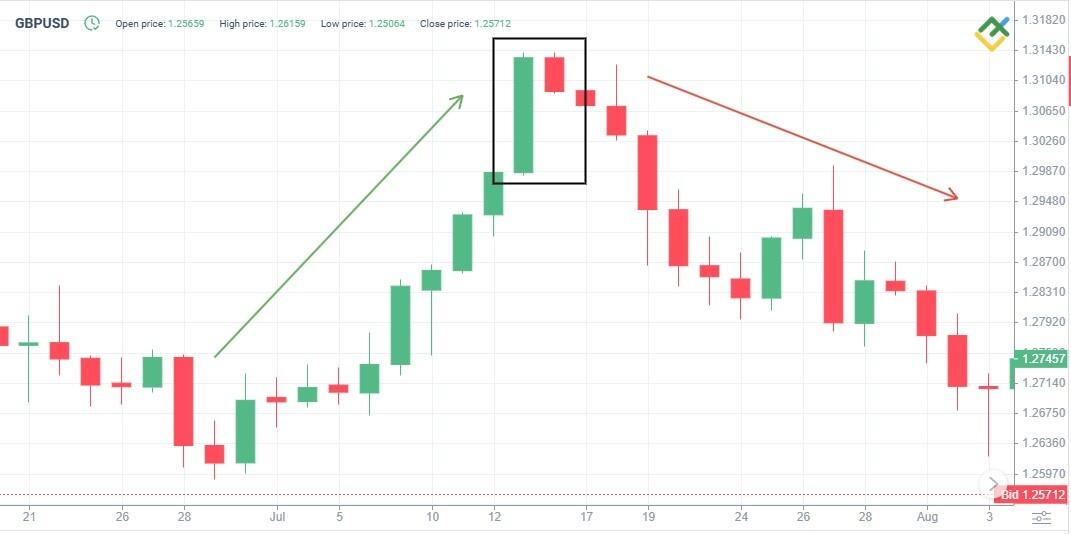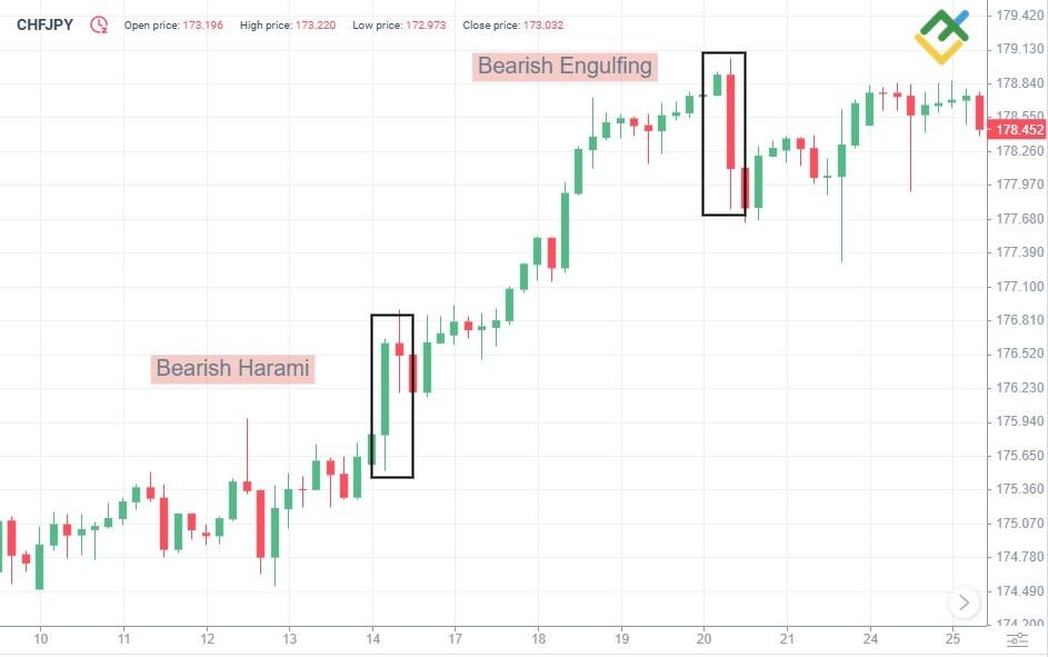 The chart below shows a Bearish Harami marked with a black frame. The pattern has formed after a long uptrend, pointing to a possible change of direction. There is a large bullish candle and a small bearish one entirely engulfed by the preceding candle. This formation signals a decelerating growth and a possible reversal. By the way, if the first candle engulfs the second one, being a Doji candlestick, it is called a Harami Cross.