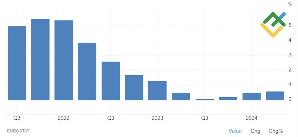 Another factor contributing to a bearish scenario was the sharp decline in the eurozone GDP growth rate. As illustrated in the screenshot below, economic growth rates in quarterly terms began to decline from Q2 2022 and reached a low of 0.0% in Q3 2023. The growth rate subsequently remained below 1% per quarter, reaching record lows. These developments reinforced the bearish outlook for the EURUSD pair, as market participants feared a potential recession in the EU.