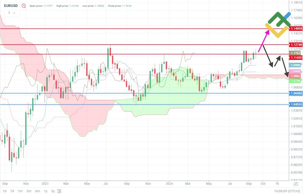The EUR/USD rate is on the rise in 2024. After reaching a low in April at 1.0600, the price increased to 1.1205 in September. Should the price maintain its current upward trajectory, it may continue to grow, potentially reaching the bullish target of 1.1495.