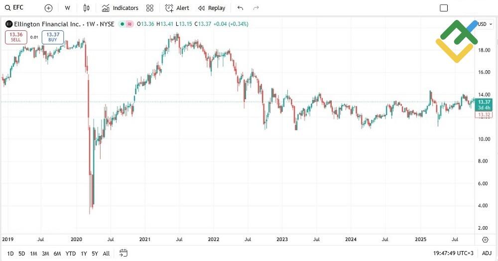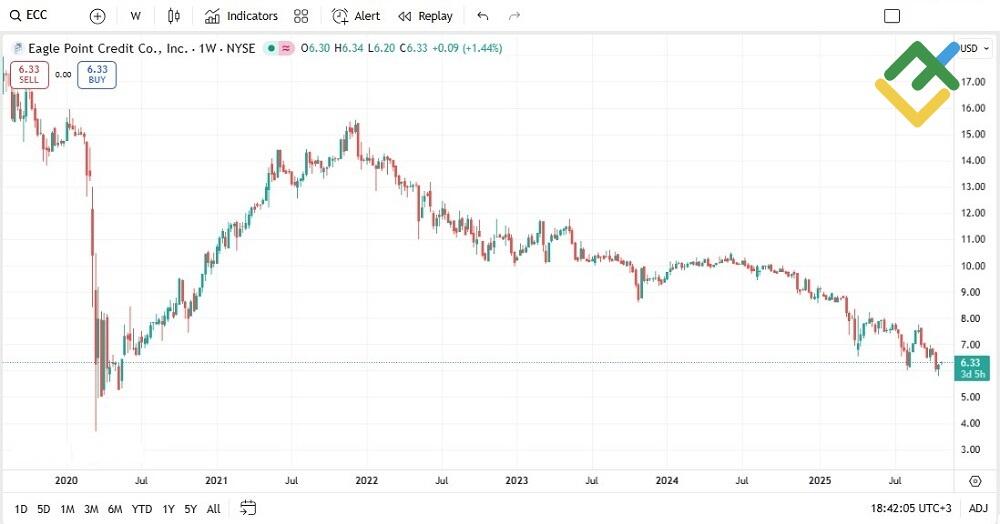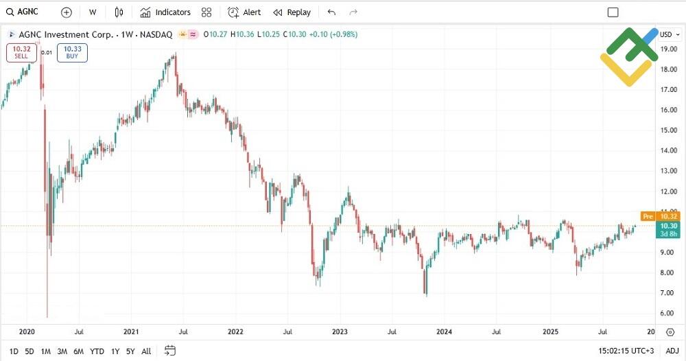 This stock is an appealing choice for investors ready to take on risk. Its share price has dropped 34% over the past year. However, over five years, the decline is only 22%. During that time, monthly dividends have ranged from $0.12 to $0.16 per share, yielding around 10–20% annually. In other words, dividends over five years could have offset the one-third drop in the stock’s price.