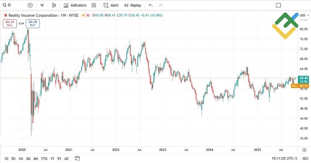 Realty Income is one of the largest companies by market capitalization, known for its high-yield stock and reliable monthly dividends. The company is committed to maintaining a steady payout schedule, with only a few brief interruptions over the years. The longest gap lasted from June 2022 to March 2023. Its dividend amount has risen from $0.23 in 2021 to $0.26 today, while the dividend yield is 5–6% per annum.