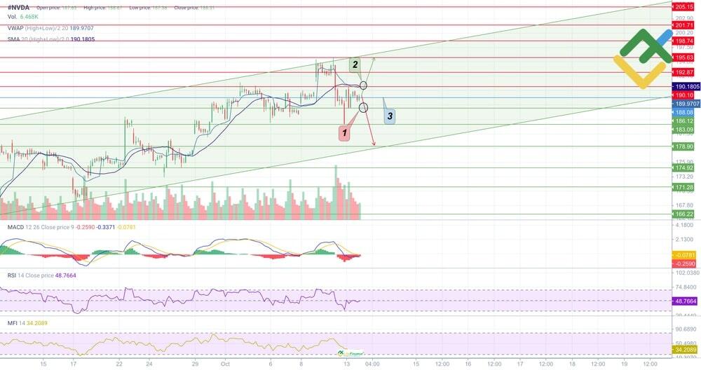 Nvidia’s stock performance depends on market sentiment, news about technological advancements, and macroeconomic indicators. The key support and resistance levels for tomorrow are $183.09 and $195.63, respectively. Technical indicators and candlestick patterns point to a potential decline.