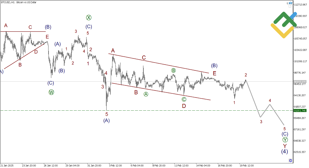 A new bullish wave is developing as an impulse (1)-(2)-(3)-(4)-(5) on the last segment of Bitcoin‘s chart. Its sub-waves (1) and (2) are completed, and impulse (3) may have formed, too. The sideways correction (4) is in progress in the form of the horizontal double three pattern W-X-Y. Its first sub-wave W is complete, and the sideways correction X has formed as an expanding triangle. The final wave Y could be in progress. It will likely form as the double zigzag [W]-[X]-[Y] near the previous low of 91,001.74, marked by wave (A). The triangle correction (B) has terminated on a smaller wave level, followed by a decline in impulse (C).