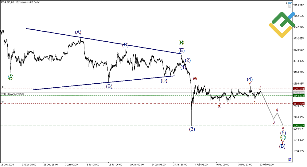 Correction (B) is expected to develop on ETHUSD‘s H1 chart, presumably as the double zigzag W-X-Y. Its final sub-wave Y, which looks like a standard zigzag [A]-[B]-[C], is in progress. Impulse [A] and the triangle correction [B] are complete. The price is likely falling in impulse [C], in its fifth part, potentially to the previous low of 2,105.00, marked by sub-wave (3).