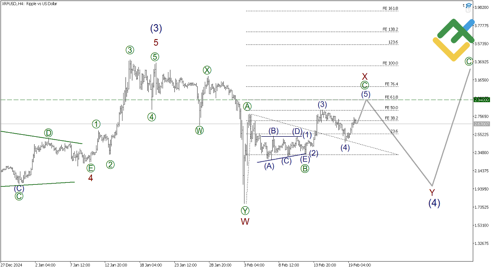 The XRPUSD chart shows a bullish impulse (1)-(2)-(3)-(4)-(5). Its large impulse sub-wave (3) is likely completed, and correction (4) has started developing, potentially as the double zigzag W-X-Y. The motive wave W has formed. Linking wave X may develop as a standard zigzag [A]-[B]-[C] once the sub-wave [C] completes. It is projected to end near 2.940, where impulse [C] will retrace 61.8% of wave [A], according to Fibonacci ratios.