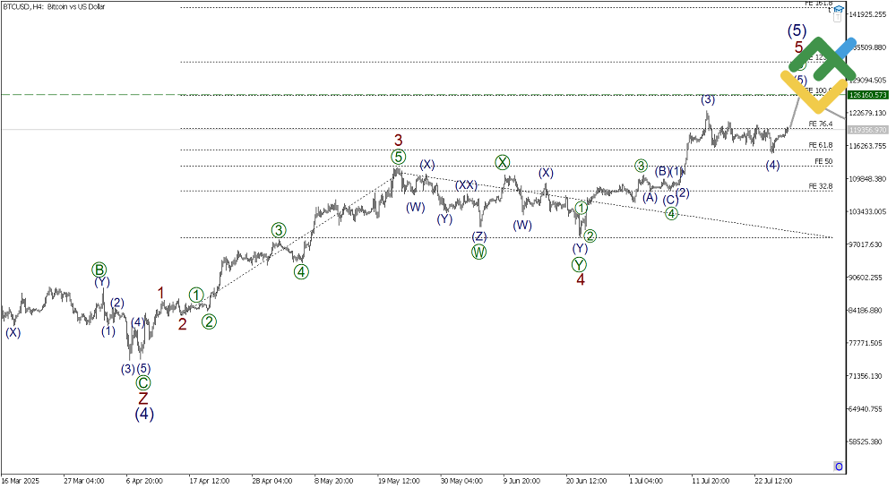 On the H4 chart of Bitcoin, the final part of the large impulse (1)-(2)-(3)-(4)-(5) is currently unfolding. Correction 4 may have ended within sub-wave (5). The price is now rising in sub-wave 5. The four parts of this wave have already finished, and the asset is expected to climb to the 126,160.57 level within sub-wave [5]. At that level, wave 5 will equal 100% of impulse 3 based on Fibonacci ratios.