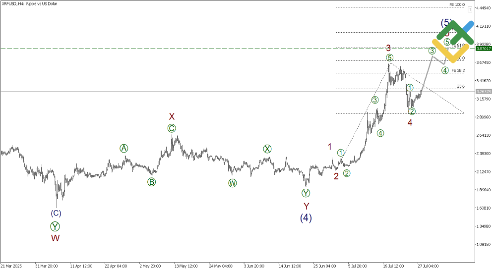 From a global perspective, a bullish impulse (1)-(2)-(3)-(4)-(5) is developing on the XRPUSD chart. Correction (4), which took the form of a double three, has recently completed. Impulse (5) is currently unfolding. Its subwaves 1-2-3-4 appear to be complete. As a result, the price is expected to rise soon in the final sub-wave 5 to the 3.870 level. At that level, the size of wave 5 will be 61.8% of wave 3 based on Fibonacci ratios.