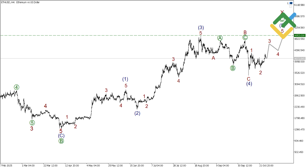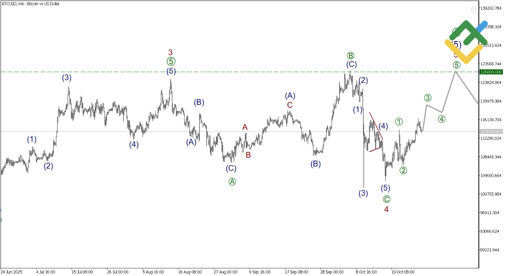 The H4 chart of Bitcoin shows the formation of the second half of impulse 1-2-3-4-5. Correction 4 has most likely developed as a simple zigzag [A]-[B]-[C]. The first stage of sub-wave 5 is forming in the last segment of the chart. An impulse is expected to form in the near term, targeting the previous high of 126,000.00. This level also marks the end of the sideways correction [B].