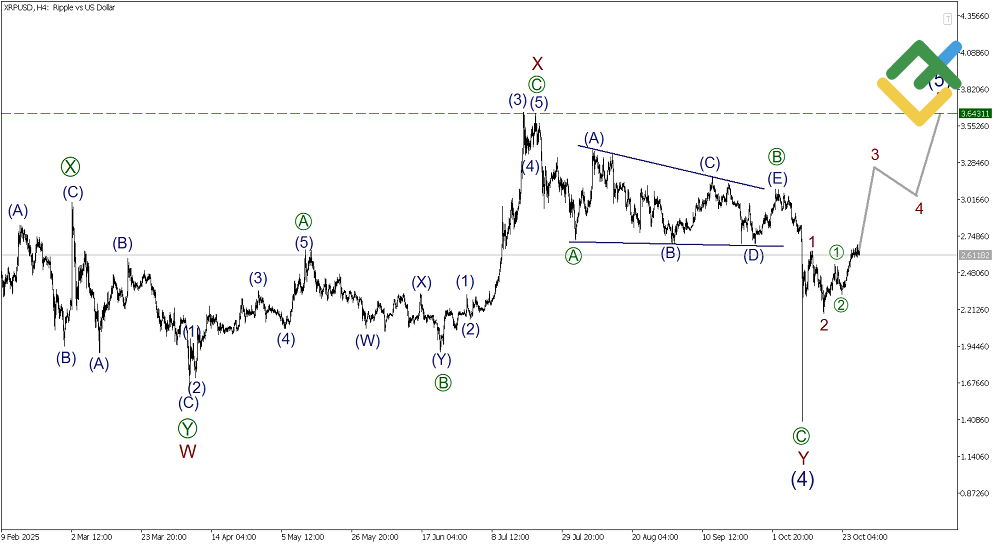 From a global perspective, a bullish impulse (1)-(2)-(3)-(4)-(5) is developing on the XRPUSD chart. Correction (4) has likely ended recently as a double three pattern, W-X-Y, and impulse (5) is currently unfolding. Within it, sub-waves 3-4-5 are developing. The price will most likely rise within this impulse to the previous high of 3.643, where the linking wave X was previously completed.