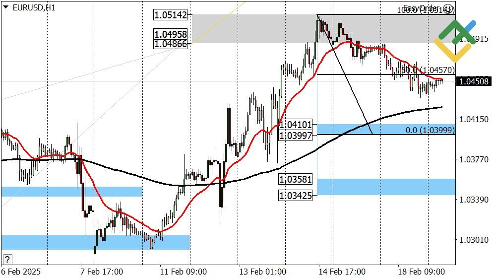 The EUR/USD pair is correcting downward, with a possible target in support area (А) 1.0410 – 1.0399. Once this zone is reached, new longs can be considered with the first target at 1.0457 and the second one near the high of February 14.