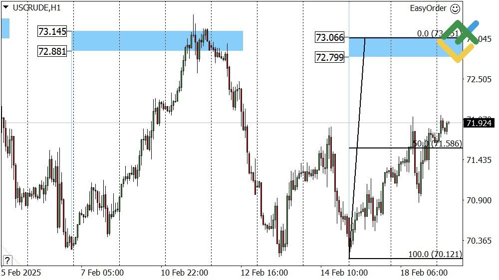 The oil price is trading within an upward correction of a short-term downtrend. Testing the resistance (А) 73.06 – 72.79 could be the target of this correction. Once the zone is tested, consider short trades with the first target of 71.58 and the second one near 70.12.