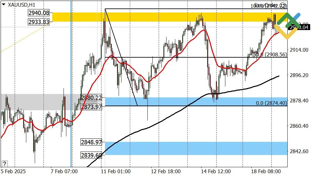 Yesterday, gold reached the golden target 2940 – 2933 once again. The remaining portion of longs opened from support (А) 2880 – 2873 should be closed. The further trend direction will depend on whether buyers can break through the golden zone and consolidate above it. If they can, the next growth target will be the target zone 3008 – 2996.