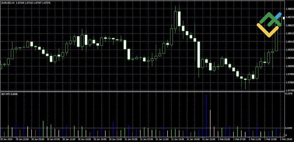 Bill Williams’ mfi index is displayed in a separate window below the price chart. It appears as a histogram consisting of color coded bars of different heights. The histogram bars rise or fall relative to the zero (baseline) level.