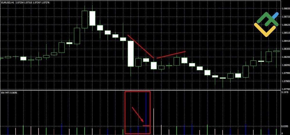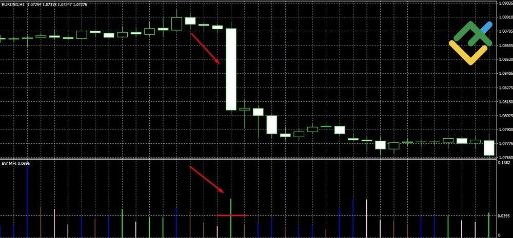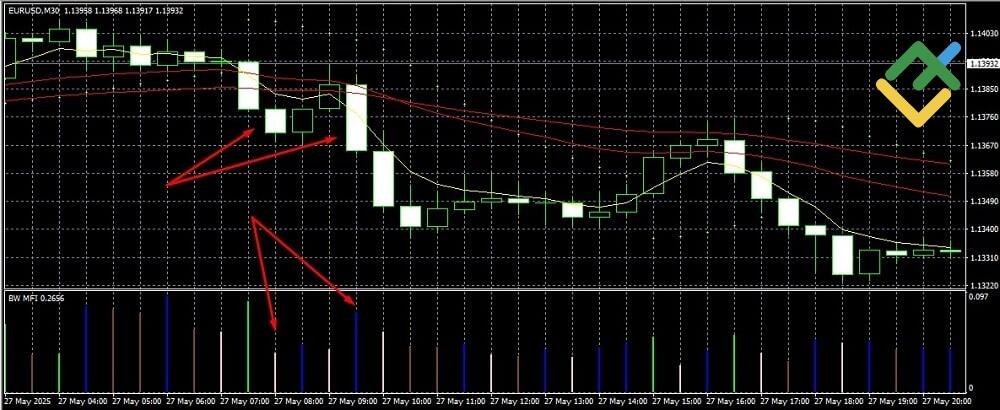 - On the first signal candle, the pink bar indicates a balance between buyers and sellers. According to the MFI trading theory, it’s recommended to place pending orders in both directions — above the high and below the low of the signal candle. In this case, both would be triggered but result in a loss, as there is no directional price movement.