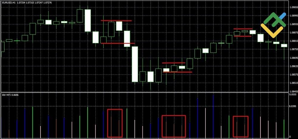 Pink bars (MFI down, volume up) indicate a struggle that often precedes the formation of a new trend. The range narrows while trading volumes rise.