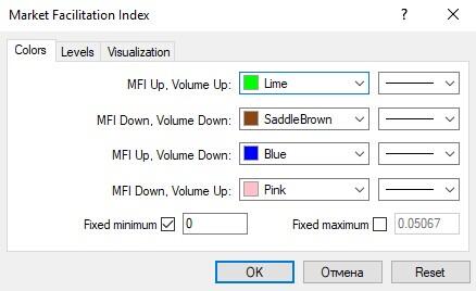 - Colors. Here you can select the color and thickness of each histogram bar. You can also fix the upper and lower boundaries of the range in which the indicator moves. This is useful for visually comparing BW MFI values when analyzing price history.