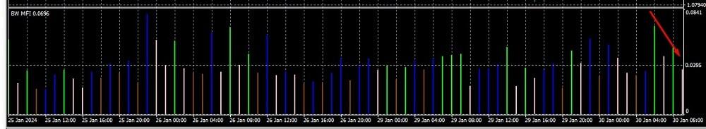 Brown bars (MFI down, volume falls) indicate a fading interest. The price range narrows, and trader interest declines.