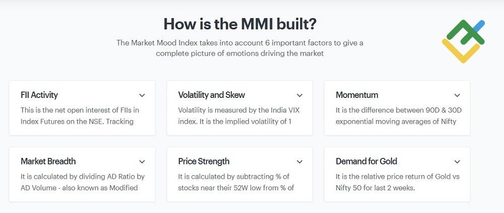- The MMI score is calculated using several market indicators, including the volatility index (VIX Index), market breadth, safe-haven demand, institutional investor activity (FII activity), and price strength based on 52-week highs.