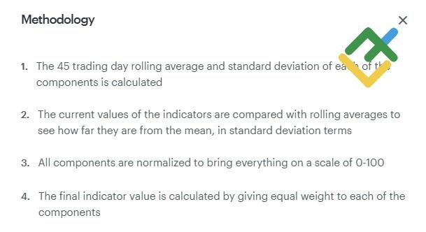 Price momentum, price strength, market breadth, the ratio of call to put options, market volatility, safe haven demand, and junk bond demand. The index is based on U.S. stock market data, with stocks, bonds (Treasuries), and options serving as the main assets used in the calculation.